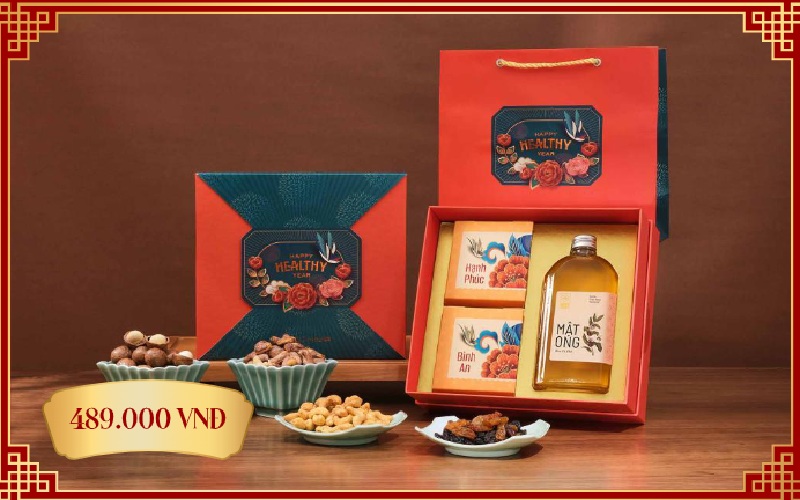 - Thành phần dinh dưỡng, tốt cho sức khỏe: Các loại hạt như hạnh nhân, macca, hạt điều, nho khô hay táo đỏ mang thông điệp “quà Tết healthy” – phù hợp xu hướng sống xanh, sống lành mạnh.