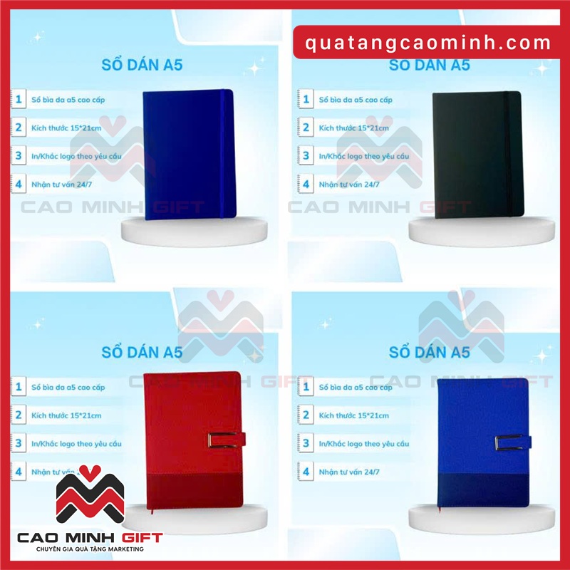 Với kinh nghiệm nhiều năm trong lĩnh vực quà tặng doanh nghiệp, Cao Minh Gift mang đến giải pháp sổ dán A5 số lượng lớn đáp ứng đồng thời các tiêu chí: đẹp – bền – đúng ngân sách – đúng tiến độ. Nhờ sản xuất và gia công trực tiếp, Cao Minh giúp doanh nghiệp tối ưu chi phí với giá sỉ tận xưởng, phù hợp cho cả đơn hàng số lượng ít lẫn số lượng lớn.