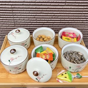 • BỘ BÁT CAO CẤP ĐỰNG BÁNH KẸO TẾT_ SỨ SẠCH MEN KEM_ họa tiết hoa đào hồng